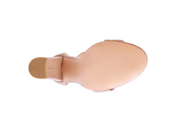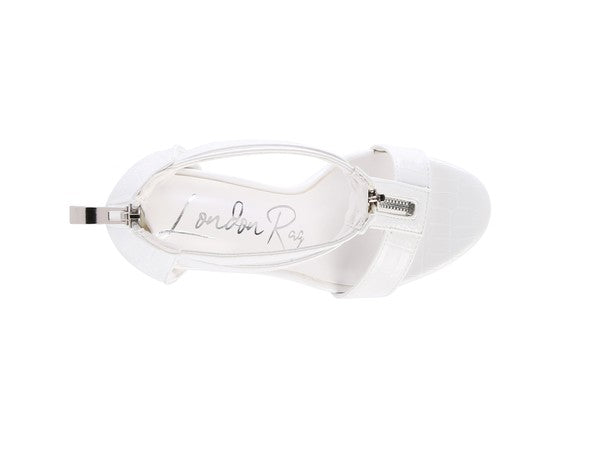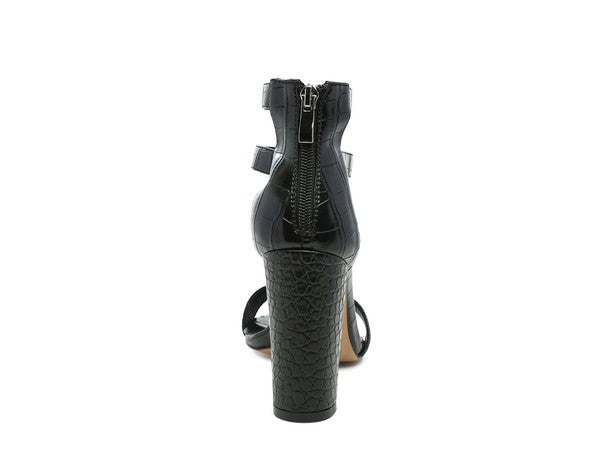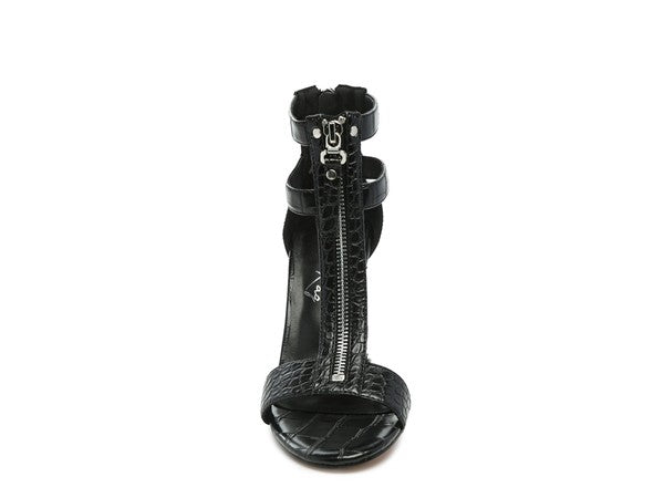 Sandalia de tacón alto con textura de cocodrilo y cremallera delantera y trasera. Esta elegante sandalia luce espectacular y cuenta con una suave plantilla antideslizante.